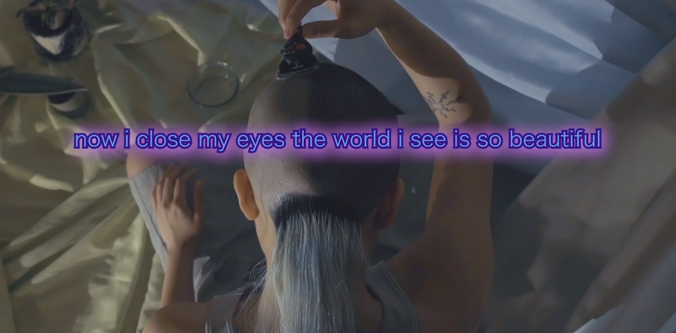 Some videos ask us to consider our performances online on social platforms, such as Traveling Solo ASL Story via Zodiac Signs which plays with online influencer Instagram culture, or OHYUNG: now i close my eyes the world i see is so beautiful which creates a virtual world where avatars of the living and dead reunite and are projected back onto the body.